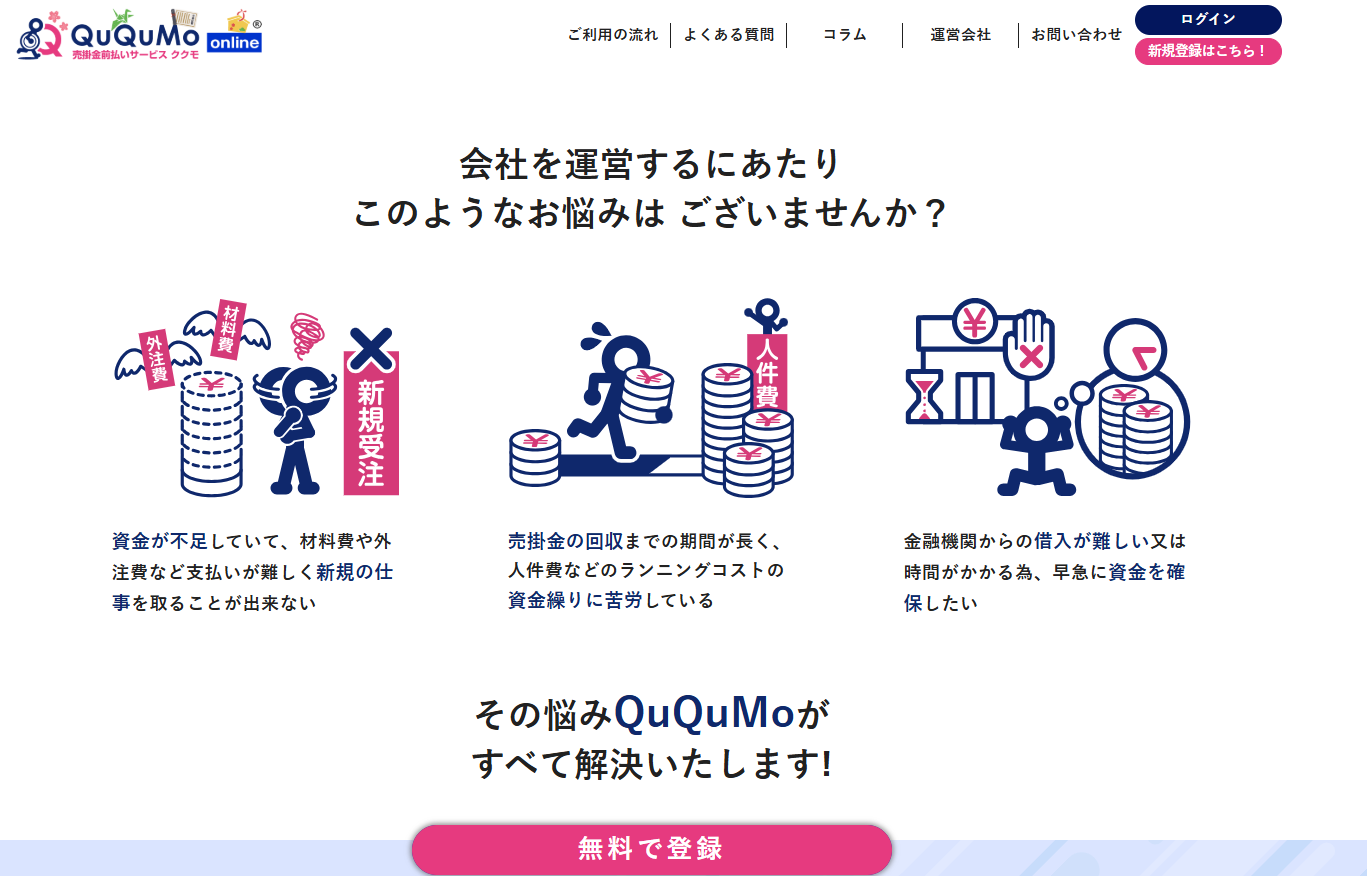 より手軽に資金調達を進めたい方には、オンライン完結型のファクタリングサービスが大変便利です。オンライン完結型の大きな利点は、場所や時間を問わず手続きができることです。例えば、「QuQuMo」は請求書と通帳コピーの2点のみで申し込み可能で、オンライン完全対応を実現しているため、多忙な経営者にも使いやすいサービスと言えるでしょう。